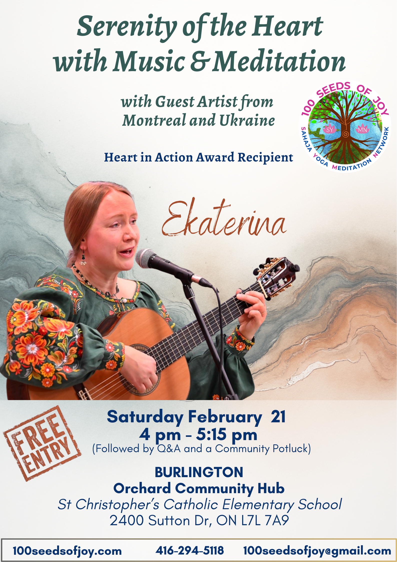 Ekaterina is a talented Canadian-Ukrainian singer and guitarist visiting from Montreal. She is an artist who has performances mostly in the Quebec area. She is also a Heart In Action Awardrecipient & a dedicated volunteer supporting refugees in her community. Ekaterina will share songs in English, French, and Ukrainian, along with an ancient Sanskrit hymn for the heart, accompanied by guitar and melodic percussion instruments.