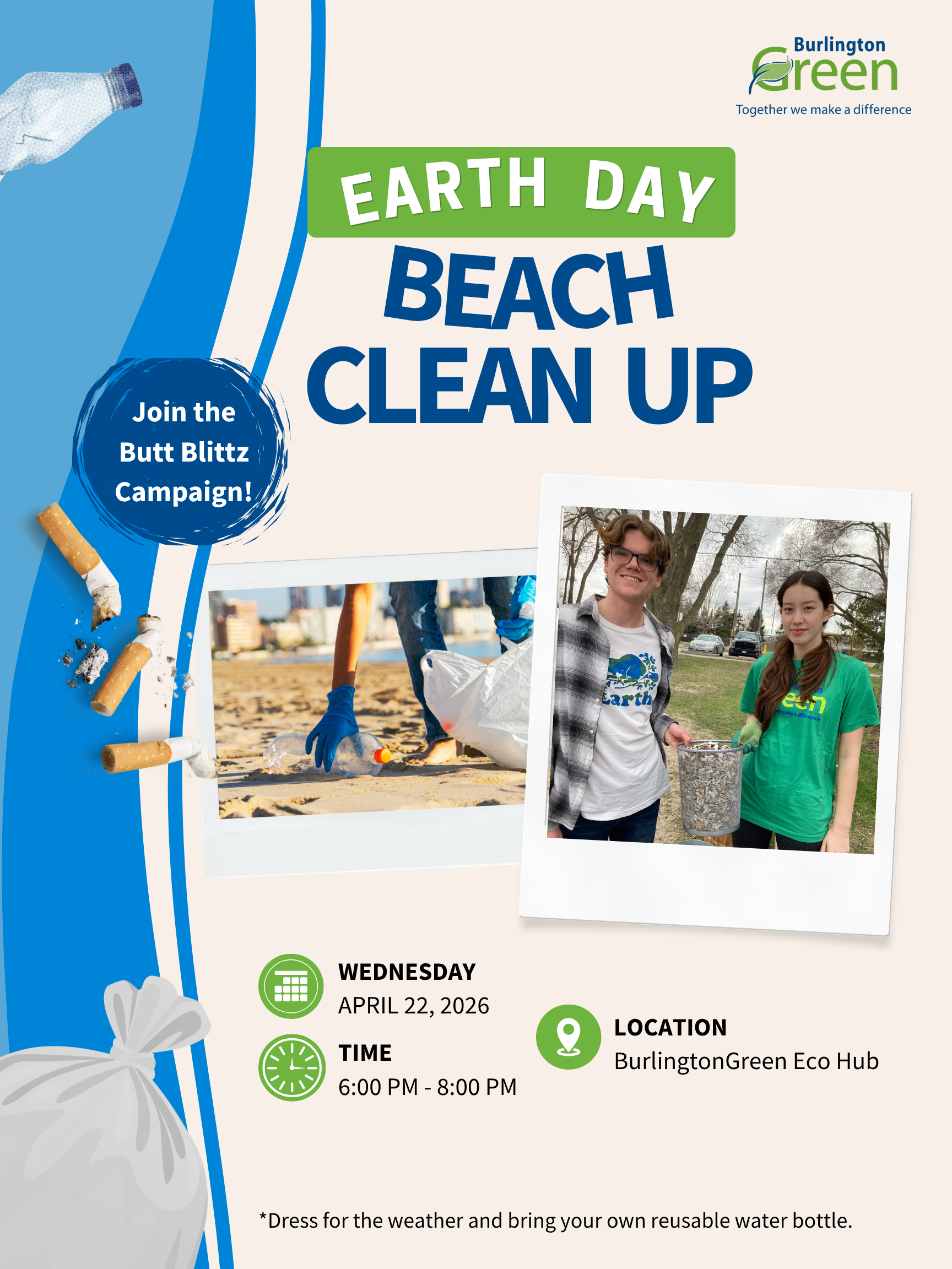 Join us on April 22 from 6 to 8pm at our BurlingtonGreen Eco Hub for an Earth Day Beach Clean-Up as part of A Greener Future's Butt Blitz campaign. Register here: https://www.agreenerfuture.ca/events-list/burlington-beach-april-2026
